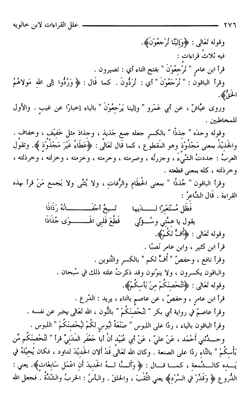 وحدَّثني أَحْمَد، عَنْ عليّ، عَنْ أبي عُبَيْدٍ أنَّ أبا جَعْفَر المَدَنِيُّ قرأ «لِتُحْصِنَكُم مِّن بَأْسِكُمْ» بالتَّاءِ ردًا على الصنَّعة. وكان الله تَعَالى قَدْ أَلَان الحَدِيْدَ لداود، فكان يُحِيْلُهُ في يَدِه كالشَّمعةِ، كما قال: {وَأَلَنَّا لَهُ الْحَدِيدَ أَنِ اعْمَلْ سَابِغَاتٍ}. يعني: