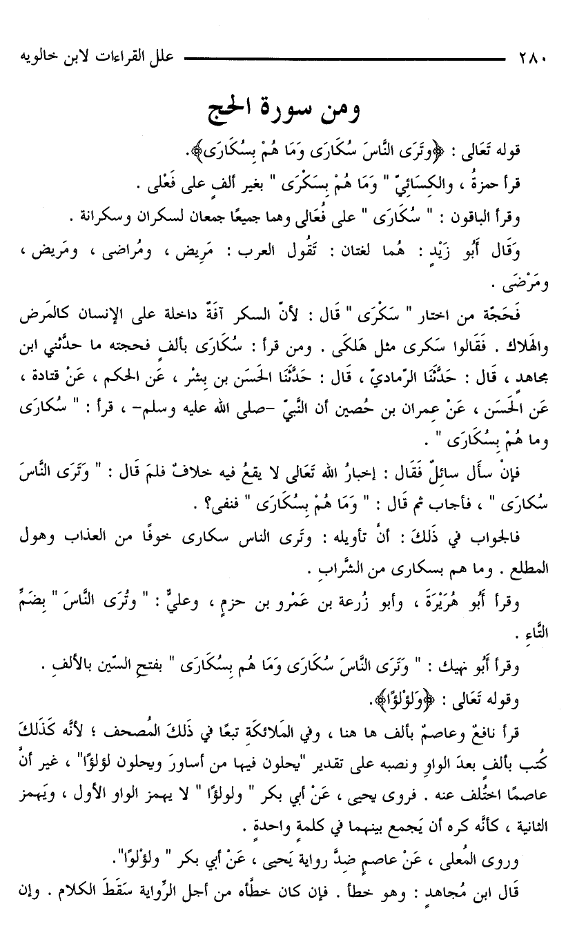 فَحَجّة من اختار «سَكْرَى» قَالَ: لأنّ السكر آفَةٌ داخلة على الإنسان كالمَرض والهَلاك. فَقَالُوا سَكرى مثل هَلْكَى. ومن قرأ: سُكَارىَ بألفٍ فحجته ما حدَّثني ابنُ مجاهدٍ، قَالَ: حَدَّثَنَا الرّماديّ، قَالَ: حَدَّثَنَا الحَسَن بْن بِشْر، عَنْ الحكم، عَنْ قتادة، عَنْ الحَسَن، عَنْ عِمران بْن حُصين أن النَّبيّ - صَلَّى اللَّهُ عَلَيْهِ وَسَلَّمَ -، قرأ: «سُكارَى وما هُمْ بِسُكَارَى».