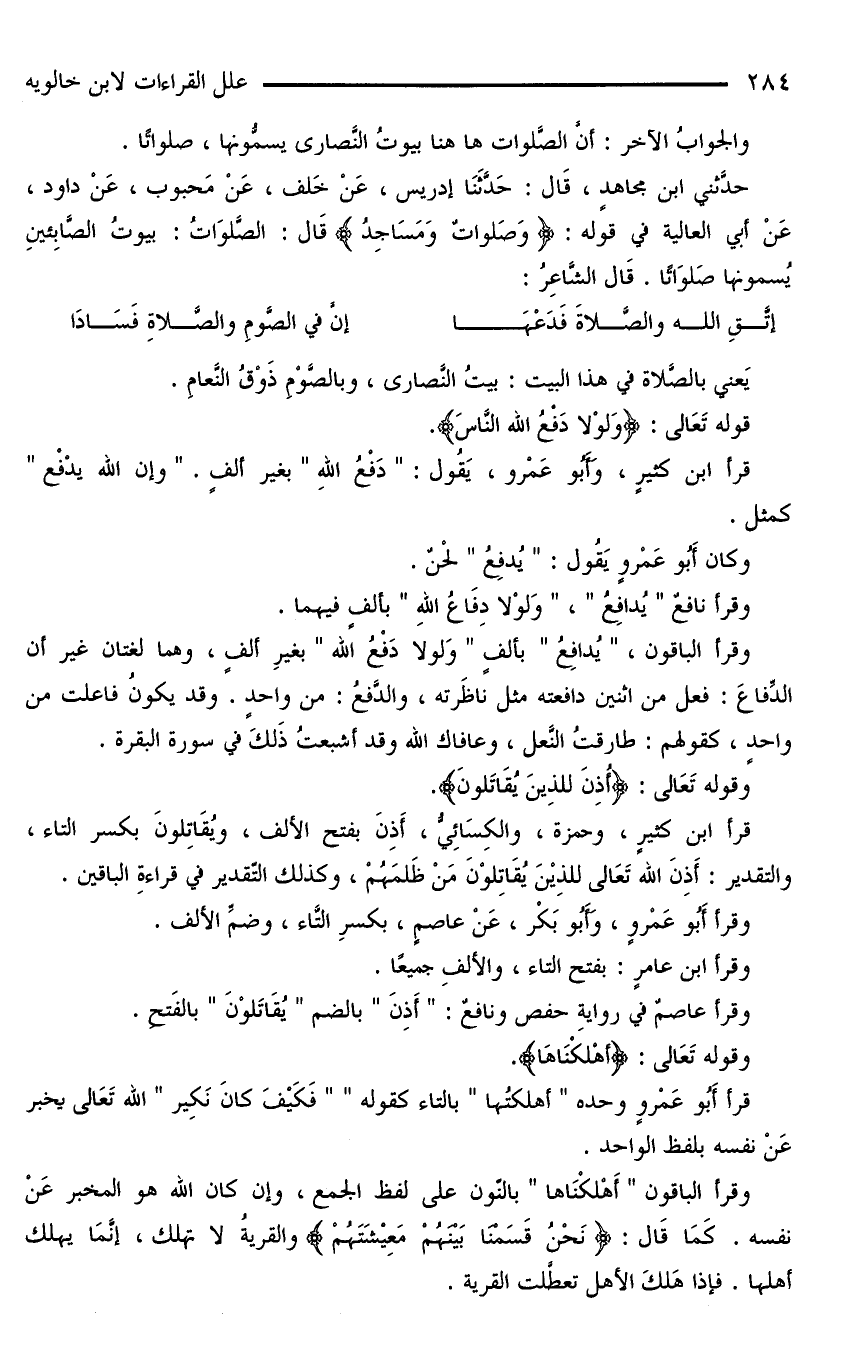 حدَّثني ابنُ مجاهدٍ، قَالَ: حَدَّثَنَا إدريس، عَنْ خَلف، عَنْ مَحبوب، عَنْ داود، عَنْ أبي العالية في قوله: {وَصَلَواتٌ وَمَسَاجِدُ} قَالَ: الصَّلَوَاتُ: بيوتُ الصَّابِئينِ يُسمونها صَلَوَاتًا. قَالَ الشَّاعِرُ: