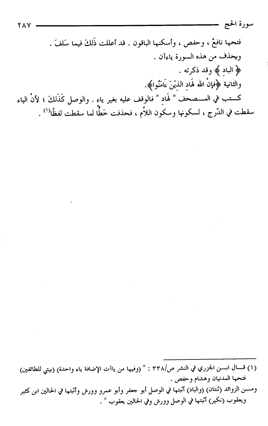 ومن الزوائد (ثنتان) (والباد) أثبتها في الوصل أبو جعفر وأبو عمرو وورش وأثبتها في الحالين ابن كثير ويعقوب (نكير) أثبتها في الوصل وورش وفي الحالين يعقوب».
