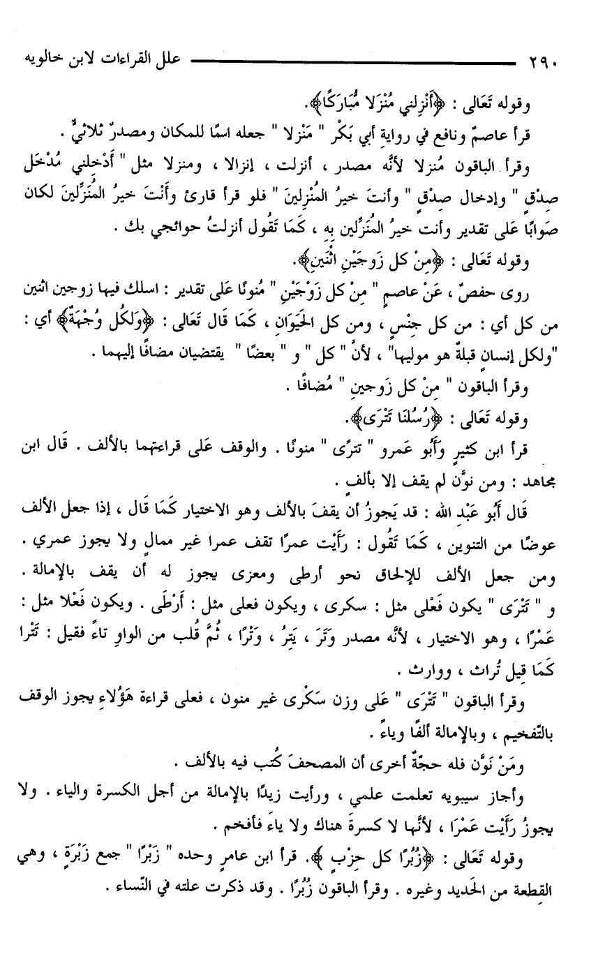وقرأ الباقون مُنزلًا لأنَّه مصدر، أنزلت، إنزالًا، ومنزلًا مثل «أَدْخِلْني مُدْخَلَ صِدْقٍ» وإدخال صِدْقٍ «وأنتَ خيرُ المُنْزِلِينَ» فلو قرأ قارئٌ وأَنْتَ خيرُ المُنَزِّلِينَ لكان صَوابًا عَلَى تقدير وأنت خيرُ المُنَزِّلين بِهِ، كَمَا تَقُولُ أنزلتُ حوائجي بك.