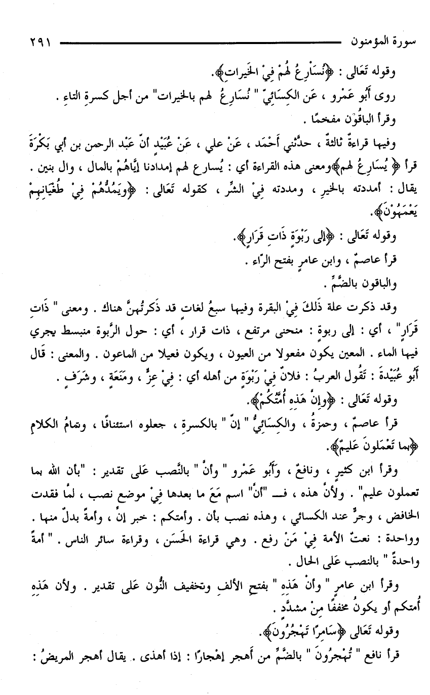 وقد ذكرت علة ذَلِكَ فِيْ البقرة وفيها سبعُ لُغاتٍ قد ذَكرتُهنَّ هناك. ومعنى «ذَاتِ قَرَارٍ»، أي: إلى ربوةٍ: منحنى مرتفع، ذات قرار، أي: حول الرَّبوة منبسط يجري فيها الماء. المعين يكون مفعولًا من العيون، ويكون فعيلًا من الماعون. والمعنى: قَالَ أَبُو عُبَيْدةَ: تَقُولُ العربُ: فلانٌ فِيْ رَبْوَةٍ من أهله أي: فِيْ عِزٍّ، ومَنَعَةٍ، وشَرَفٍ.