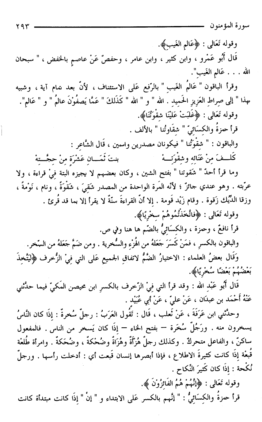 وما قرأ أحدٌ «شَقوتنا» بفتح الشين، وكان بعضهم لا يجيزه البّتة فِيْ قراءة، ولا عرّبته. وهو عندي جائز؛ لأنه المَرة الواحدة من المصدر شَقِيَ، شَقْوَةً، ونام، نَوْمةً، وزقا الدِّيُك زَقوة. وقام زَيْد قَومة. إِلَا أنّ القراءةَ سنّةٌ لا يقرأ إلا بما قد قُرِئَ.