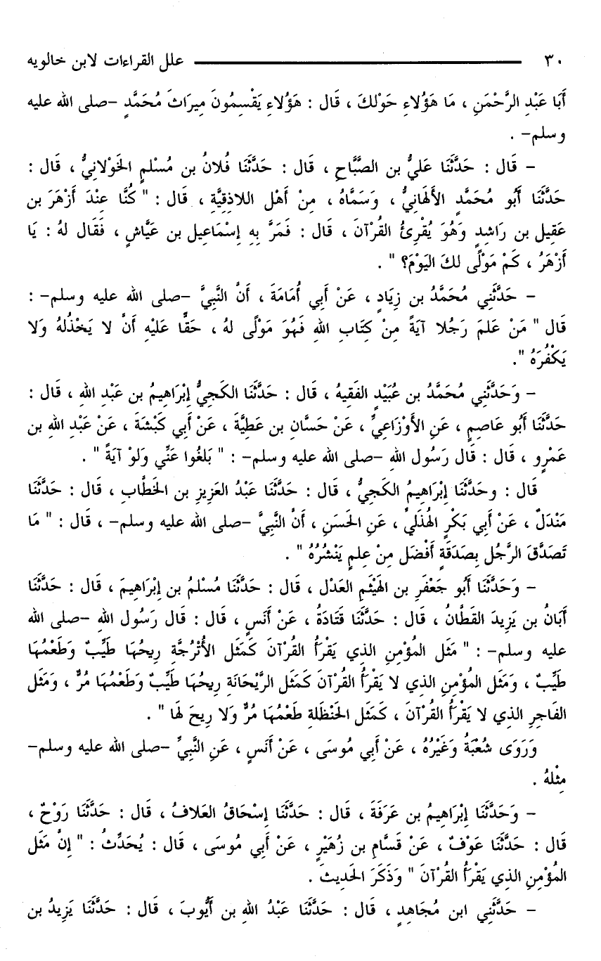 - وَحَدَّثَنَا أَبُو جَعْفَرِ بْنُ الْهَيْثَمِ الْعَدْلُ، قَالَ: حَدَّثَنَا مُسْلِمُ بْنُ إِبْرَاهِيمَ، قَالَ: حَدَّثَنَا أَبَانُ بْنُ يَزِيدَ الْقَطَّانُ، قَالَ: حَدَّثَنَا قَتَادَةُ، عَنْ أَنَسٍ، قال: قال رسول الله - صلى الله عليه وَسَلَّمَ -: «مَثَلُ الْمُؤْمِنِ الَّذِي يَقْرَأُ الْقُرْآنَ كَمَثَلِ الْأُتْرُجَّةِ رِيحُهَا طَيِّبٌ وَطَعْمُهَا طَيِّبٌ، وَمَثَلُ الْمُؤْمِنِ الذي لا يقرأ القرآن كمثل الرَّيْحَانَةِ رِيحُهَا طَيِّبٌ وَطَعْمُهَا مُرٌّ، وَمَثَلُ الْفَاجِرِ الَّذِي لَا يَقْرَأُ الْقُرْآنَ، كَمَثَلِ الْحَنْظَلَةِ طَعْمُهَا مُرٌّ وَلَا رِيحَ لَهَا».