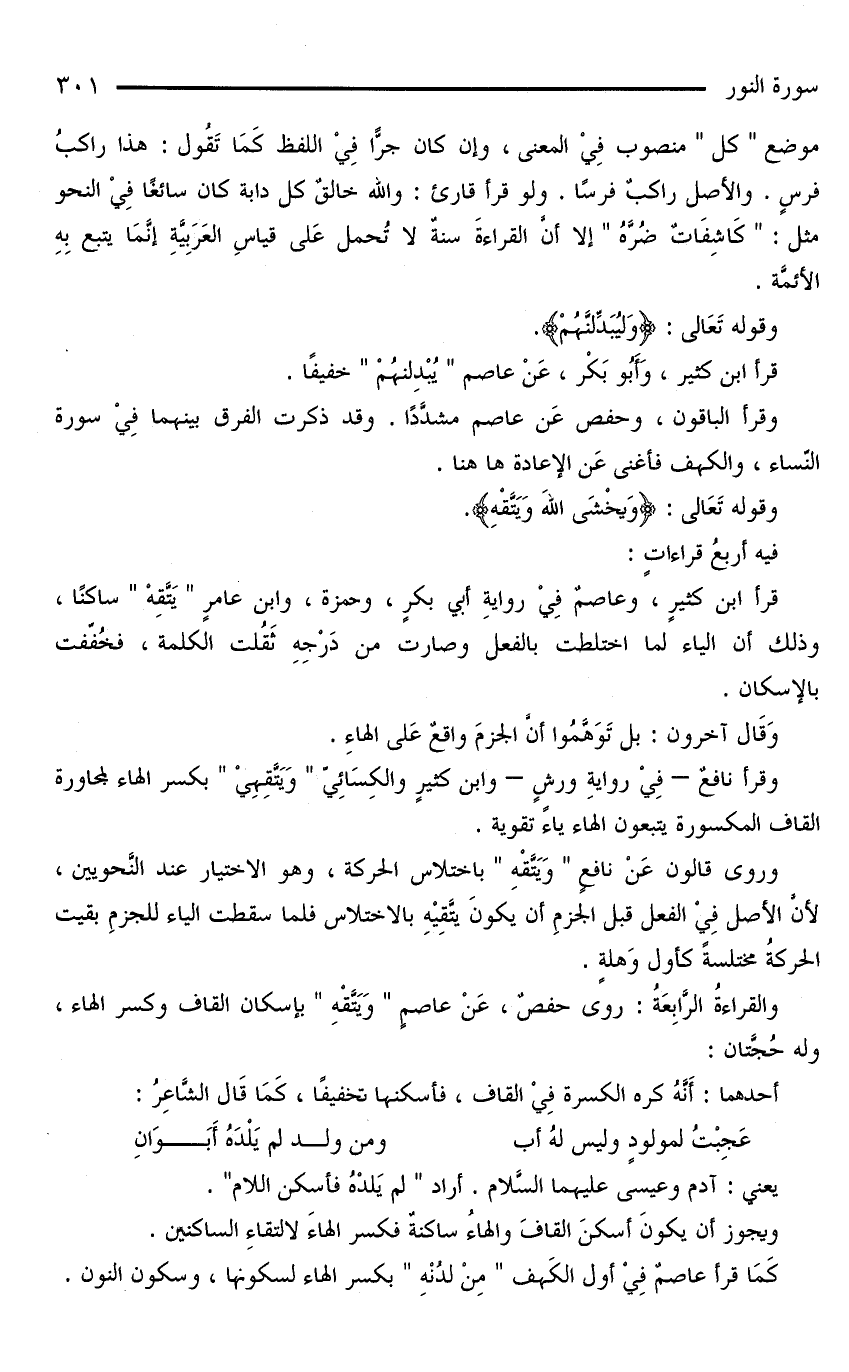 وروى قالون عَنْ نافعٍ «وَيَتَّقْهِ» باختلاس الحركة، وهو الاختيار عند النَّحويين، لأنَّ الأصلَ فِيْ الفعلِ قبلَ الجزمِ أن يكونَ يتَّقِيْهِ بالاختلاس فلما سقطت الياء للجزمِ بقيت الحركةُ مختلسةً كأول وَهلةٍ.