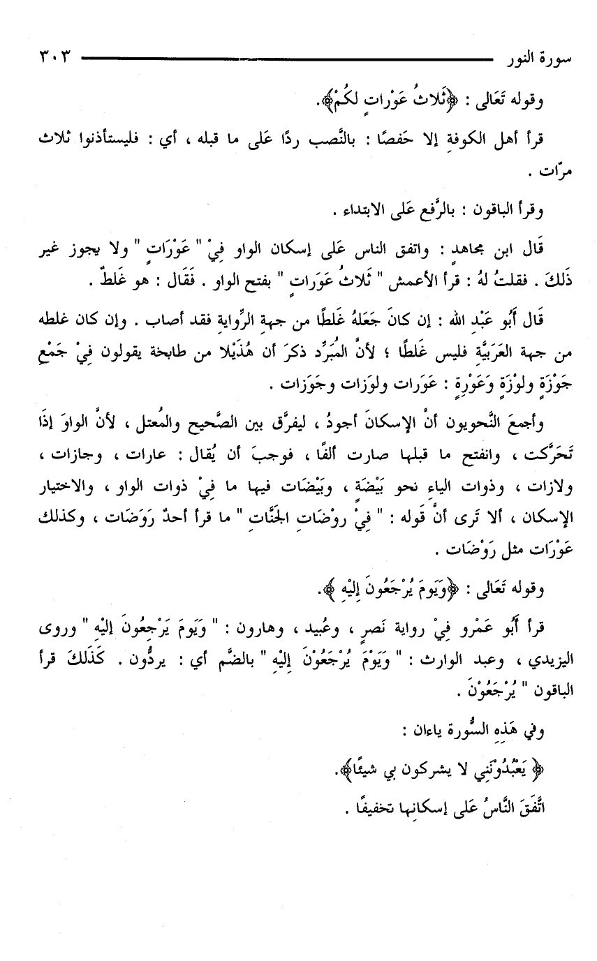 قَالَ ابنُ مجاهدٍ: واتفق الناس عَلَى إسكان الواو فِيْ «عَوْرَاتٍ» ولا يجوز غير ذَلِكَ. فقلتُ لَهُ: قرأ الأعمش «ثَلاثُ عَوَراتٍ» بفتح الواو. فَقَالَ: هو غَلَطٌ.