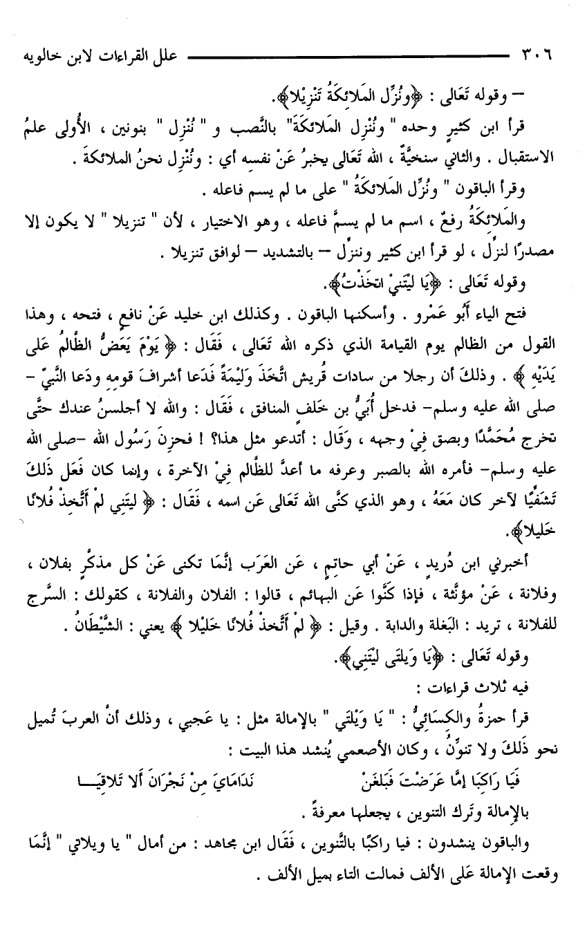 فتح الياء أبو عمرو. وأسكنها الباقون. وكذلك ابن خليد عَنْ نافعٍ، فتحه، وهذا القول من الظالم يوم القيامة الذي ذكره الله تَعَالى، فَقَالَ: {يَوْمَ يَعَضُّ الظَّالِمُ عَلَى يَدَيْهِ}. وذلكَ أن رجلًا من سادات قُريش اتَّخَذَ وَلِيْمَةً فَدَعا أشرافَ قومِهِ ودَعا النَّبيّ - صَلَّى اللَّهُ عَلَيْهِ وَسَلَّمَ - فدخل أُبَيُّ بن خلف المنافق، فقال: والله لا أجلسن عندك حتَّى تخرج مُحَمَّدًا وبصق فِيْ وجهه، وقال: أتدعو مثلَ هذا؟ ! فحزِنَ رَسُولُ الله - صَلَّى اللَّهُ عَلَيْهِ وَسَلَّمَ - فامره الله بالصبر وعرفه ما أعدَّ للظَّالِم فِيْ الآخرة، وإنما كان فَعَلَ ذَلِكَ تَشَفِّيًا لآخر كان مَعَهُ، وهو الذي كنَّى الله تَعَالى عَنْ اسمه، فَقَالَ: {لَيتَنِي لَمْ أَتَّخِذْ فُلَانًا خَلِيلًا}.