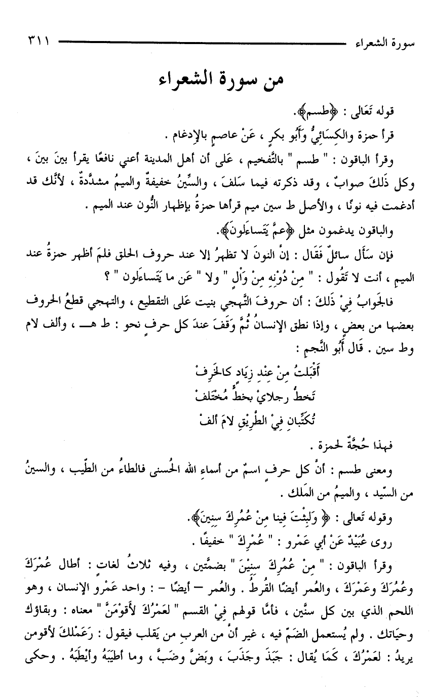 وقرأ الباقون: «طسم» بالتَّفخيم، عَلَى أن أهل المدينة أعنى نافعًا يقرأ بينَ بينَ، وكلُّ ذَلِكَ صوابٌ، وقد ذكرته فيما سَلَفَ، والسِّينُ خفيفة والميم مشددة، لأنك قد أدغمت فيه نونًا، والأصلُ ط سين ميم قرأها حمزةُ بإظهار النُّون عند الميم.