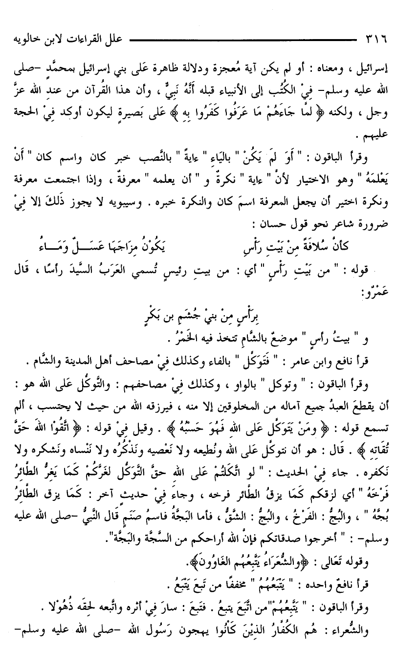 وقرأ الباقون: «أَوَ لم يكن» بالياء «ءاية» بالنَّصب خبر كان واسم كان «أَنْ يَعْلَمَهُ» وهو الاختيار لأن «ءاية» نكرةٌ و «أن يعلمه» معرفةٌ، وإذا اجتمعت معرفة ونكرة اختير أن يجعل المعرفة اسمَ كان والنكرة خبره. وسيبويه لا يجوز ذَلِكَ إلا فِيْ ضرورة شاعر نحو قول حسان: