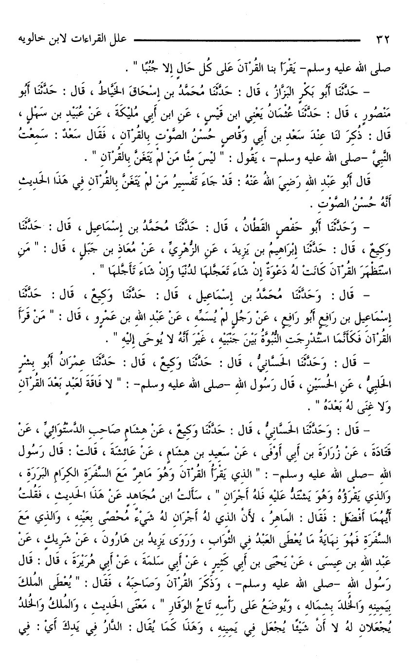 - حَدَّثَنَا أَبُو بَكْرٍ الْبَزَّازُ، قَالَ: حَدَّثَنَا مُحَمَّدُ بْنُ إِسْحَاقَ الْخَيَّاطُ، قَالَ: حَدَّثَنَا أَبُو مَنْصُورٍ، قَالَ: حَدَّثَنَا عُثْمَانُ يَعْنِي ابْنَ قَيْسٍ، عَنِ ابْنِ أَبِي مُلَيْكَةَ، عَنْ عُبَيْدِ بْنِ سَهْلٍ، قَالَ: ذُكِرَ لَنَا عِنْدَ سَعْدِ بْنِ أَبِي وَقَّاصٍ حُسْنُ الصَّوْتِ بِالْقُرْآنِ، فَقَالَ سَعْدٌ: سَمِعْتُ النَّبِيَّ - صَلَّى اللَّهُ عَلَيْهِ وَسَلَّمَ -، يَقُولُ: «لَيْسَ مِنَّا مَنْ لَمْ يَتَغَنَّ بِالْقُرْآنِ».