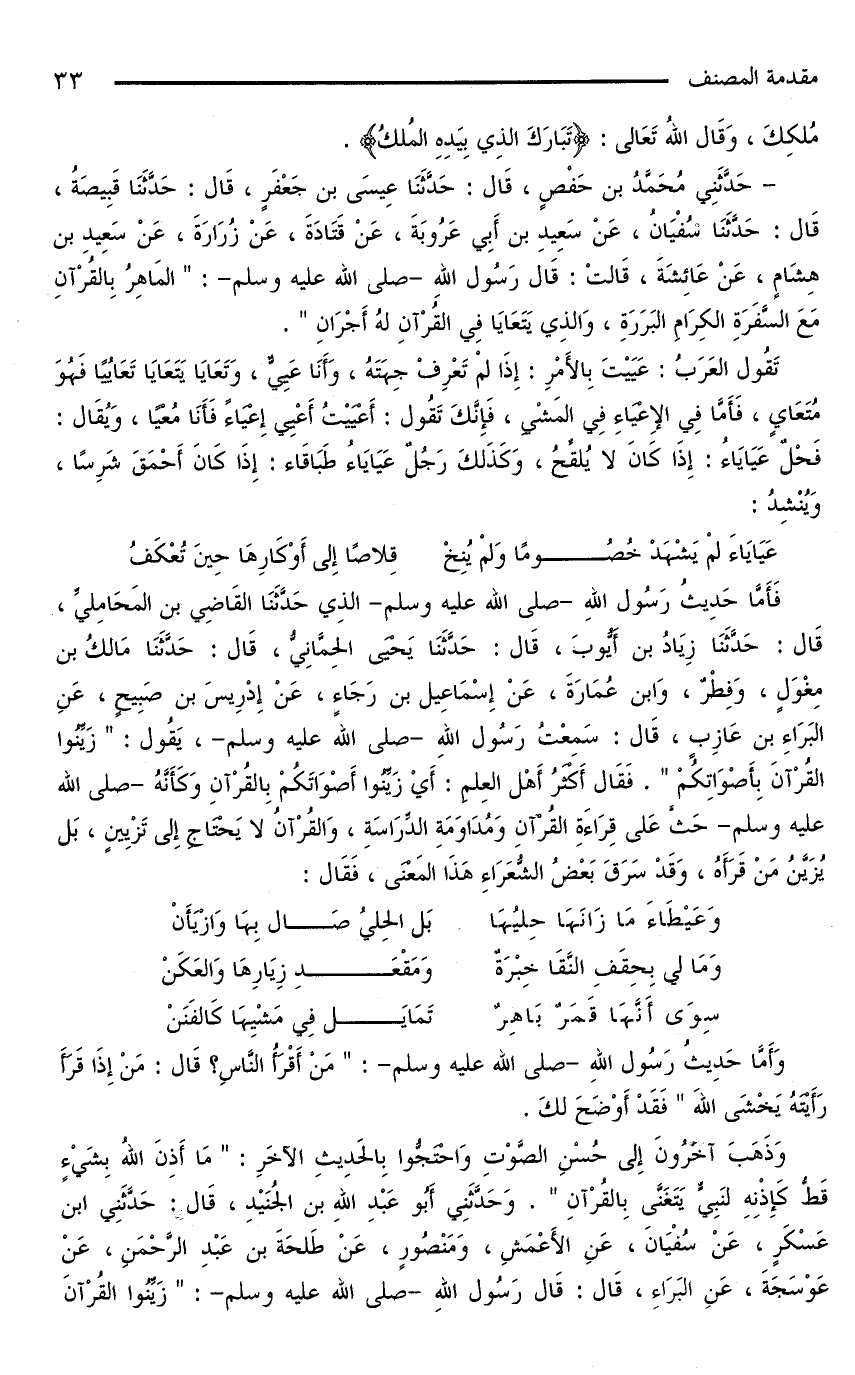 فَأَمَّا حَدِيثُ رَسُولِ اللَّهِ - صَلَّى الله عليه وسلم - الذي حدثنا القاضي بن الْمَحَامِلِيِّ، قَالَ: حَدَّثَنَا زِيَادُ بْنُ أَيُّوبَ، قَالَ: حَدَّثَنَا يَحْيَى الْحِمَّانِيُّ، قَالَ: حَدَّثَنَا مَالِكُ بْنُ مِغْوَلٍ، وَفِطْرٌ، وَابْنُ عُمَارَةَ، عَنْ إِسْمَاعِيلَ بْنِ رَجَاءٍ، عَنْ إِدْرِيسَ بْنِ صَبِيحٍ، عَنِ الْبَرَاءِ بْنِ عَازِبٍ، قَالَ: سَمِعْتُ رَسُولَ اللَّهِ - صَلَّى اللَّهُ عَلَيْهِ وَسَلَّمَ -، يَقُولُ: «زَيِّنُوُا الْقُرْآنَ بِأَصْوَاتِكُمْ». فَقَالَ أَكْثَرُ أَهْلِ الْعِلْمِ: أَيْ زَيِّنُوا أَصْوَاتَكُمْ بِالْقُرْآنِ وَكَأَنَّهُ - صَلَّى اللَّهُ عَلَيْهِ وَسَلَّمَ - حَثَّ عَلَى قِرَاءَةِ الْقُرْآنِ وَمُدَاوَمَةِ الدِّرَاسَةِ، وَالْقُرْآنُ لَا يَحْتَاجِ إِلَى تَزْيِينٍ، بَلْ يُزَيَّنُ مَنْ قَرَأَهُ، وَقَدْ سَرَقَ بَعْضُ الشُّعَرَاءِ هَذَا الْمَعْنَى، فَقَالَ: