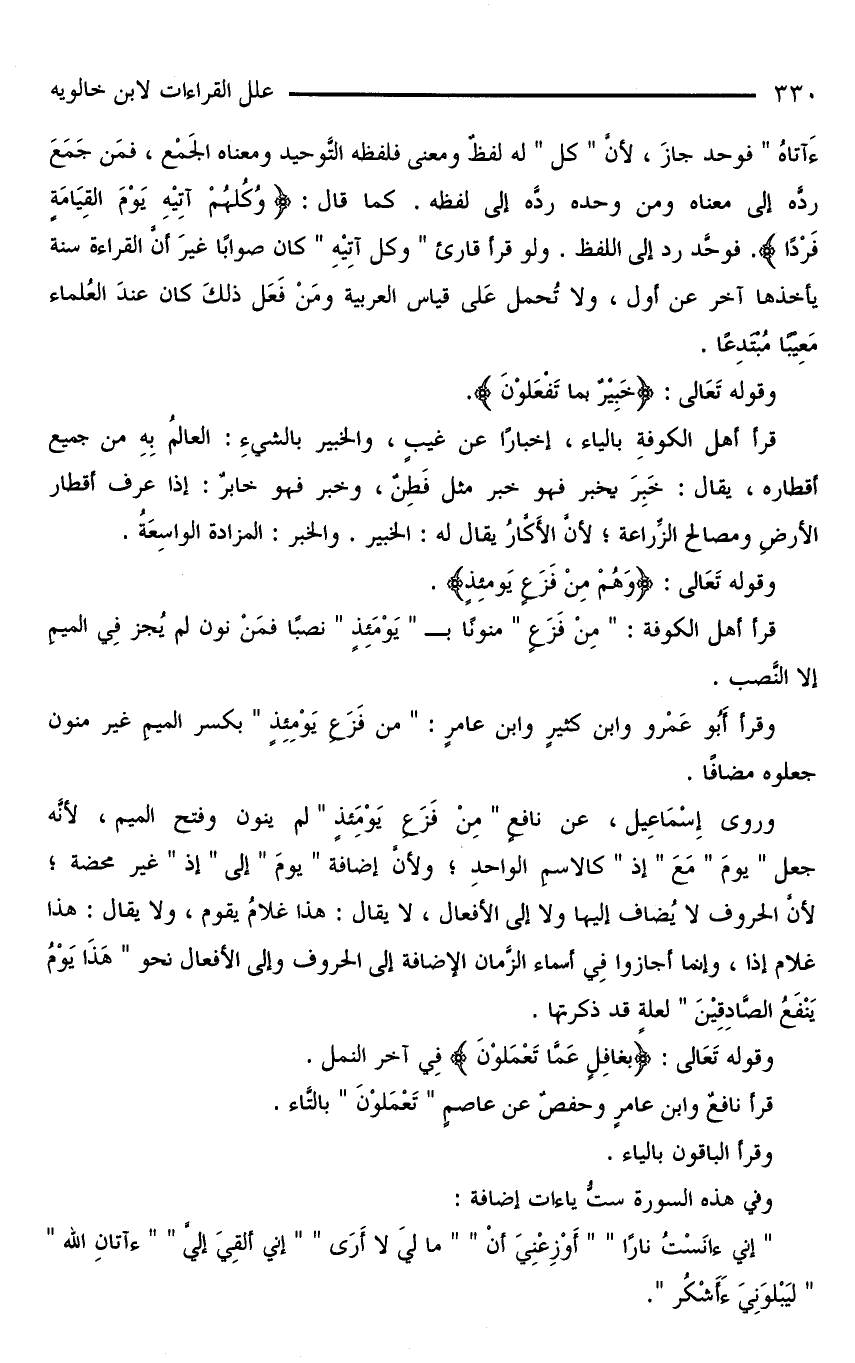 ءَآتاهُ» فوحد جازَ، لأنَّ «كلَّ» له لفظٌ ومعنى فلفظه التَّوحيد ومعناه الجَمْع، فمَن جَمَعَ ردَّه إلى معناه ومن وحده ردَّه إلى لَفظه. كما قال: {وُكُلُّهُمْ آتِيْهِ يَوْمَ القِيَامَةٍ فَرْدًا}. فوحَّد رد إلى اللفظ. ولو قرأ قارئٌ «وكلُّ آتِيْهِ» كان صوابًا غيرَ أنَّ القراءة سنة يأخذها آخر عن أول، ولا تُحمل عَلَى قياس العربية ومَنْ فَعَلَ ذلكَ كان عندَ العُلماء مَعِيْبًا مُبْتَدِعًا.