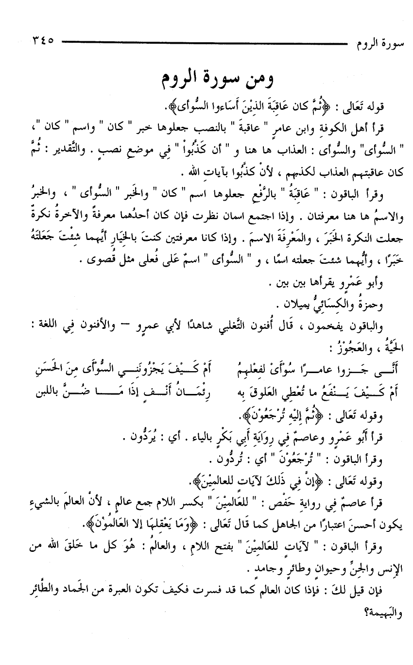 قرأ أهلُ الكوفةِ وابنُ عامرٍ «عاقبةَ» بالنصب جعلوها خبر «كان» واسم «كان»، «السُّوأى» والسوأى: العذاب هاهنا و «أن كَذَّبُواْ» فِي موضعِ نصبٍ. والتَّقدير: ثُمَّ كان عاقبتهم العذاب لكذبهم، لأنْ كذَّبُوا بآيات الله.