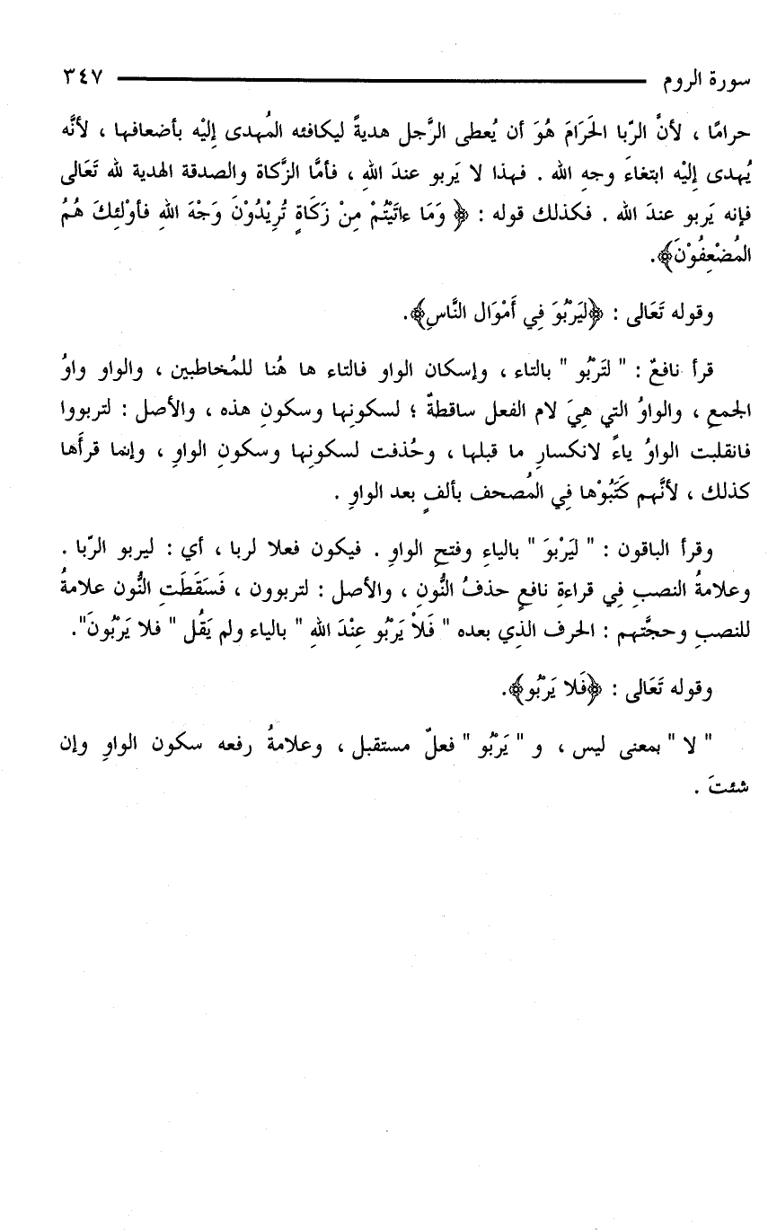 وعلامةُ النصبِ فِي قراءةِ نافعٍ حذفُ النُّونِ، والأصلُ: لتربوون، فَسَقَطَتِ النُّون علامةُ للنصبِ وحجَّتهم: الحرف الَّذِي بعده «فَلَاْ يَرْبُوا عِنْدَ اللهِ» بالياء ولم يَقُل «فلا يَرْبُونَ».