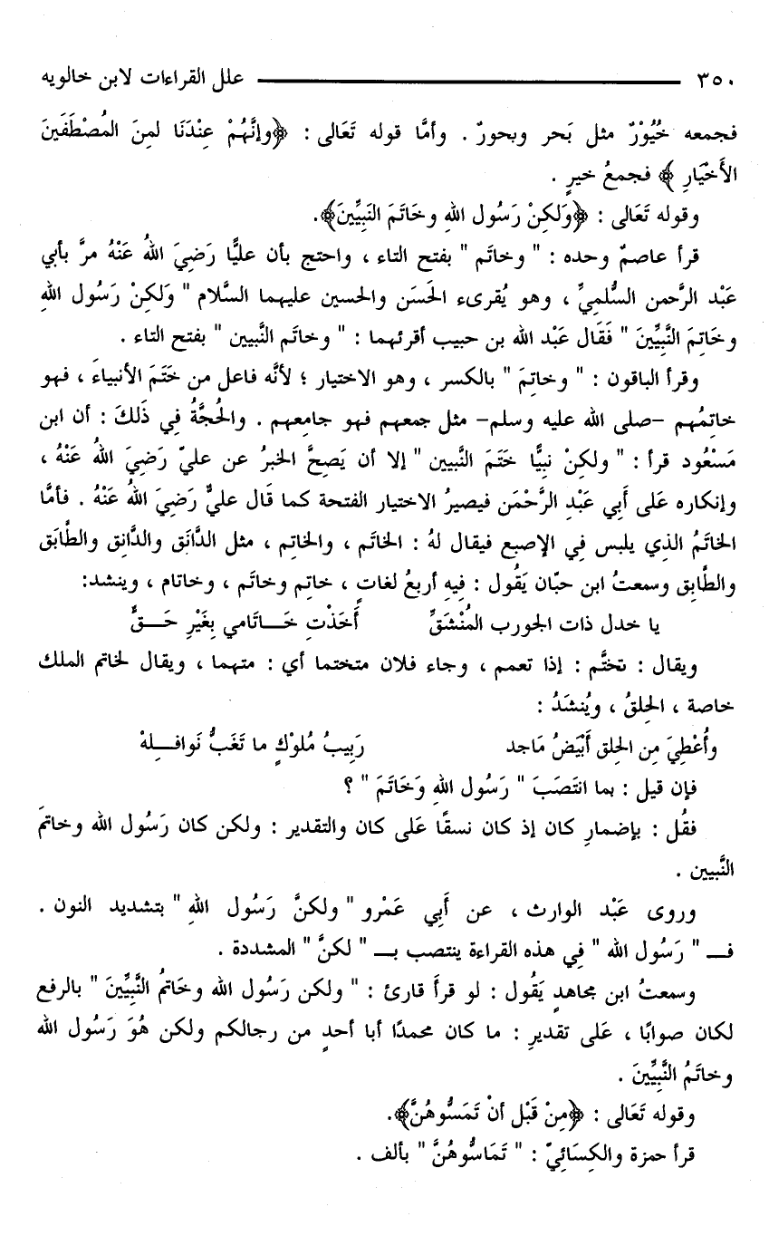 وسمعتُ ابنُ مجاهدٍ يَقُولُ: لو قرأَ قارِئٌ: «ولكن رَسُولُ اللَّه وخَاتمُ النَّبِيِّينَ» بالرفع لكان صوابًا، عَلَى تقديرِ: ما كان محمدًا أبا أحدٍ من رجالكم ولكن هُوَ رَسُولُ اللَّه وخاتَمُ النَّبِيِّينَ.