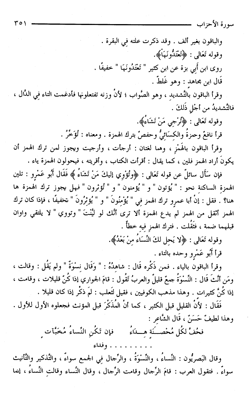فإن سَأَلَ سائلٌ عن قولُه تَعَالى: {وتُؤْوِى إلَيكَ مَنْ تَشَاءُ} فَقَالَ أَبُو عَمْرٍو: تلين الهمزةِ الساكنةِ نحو: «يُؤتون» و «يُؤمنون» و «تُؤثرون» فهل يجوز ترك الهمزة هاهنا؟ . فقل: إنَّ أبا عمرٍو ترك الهمز فِي «يُؤْمِنُونَ» و «يُؤثِرُونَ» تخفيفًا، فإذا كان ترك الهمز أثقل من الهمز لم يدع الهمزة ألا ترى أنك لو لينت «وتووي» لا يلتقي واوان قبلهما ضمة، فثَقُلت. فترك الهمزِ فِيهِ خطأٌ.