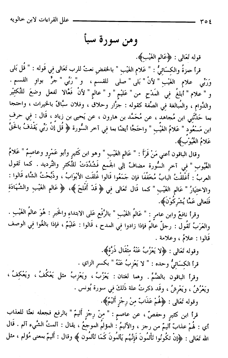 قرأ حمزةُ والكِسَائِيُّ: «عَلَّامِ الغَيْبِ» بالخفضِ نعتٌ للرب تَعَالى فِي قَولُه: «قُلْ بَلَى وَرَبِّي} علَّامِ الغَيْبِ» لأنَّ «بَلَى» صلى للقسمِ، و «رَبِّي» جرٌّ بواوِ القسمِ.