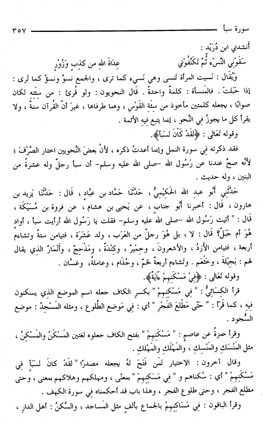 فقد ذكرته فِي سورة النمل وإنما أعدتُ ذكره، لأنَّ بعضَ النَّحويين اختار الصَّرْفَ؛ لأنَّه صحَّ عندنا عن رَسُولِ اللَّه - صَلَّى اللَّهُ عَلَيْهِ وَسَلَّمَ - أن سبأ رجلٌ وله عشرةُ من البَنين، وله حديث.