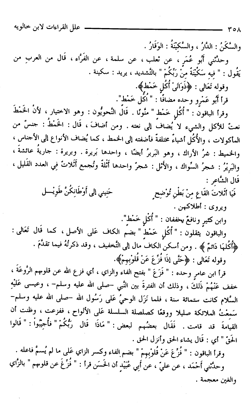 وقرأ الباقون: «أُكُلٍ خَمْطٍ» منَّونًا. قَالَ النَّحويُّون: وهو الاختيار، لأنَّ الخَمْطَ نعتٌ للأكل والشيء لا يُضاف إلى نعته. ومن أضافَ، قَالَ: الخَمْطُ: جنسٌ من المأكولات، والأُكُلِ أشياءٌ مختلفةٌ فأضفته إلى الخمط، كما يُضاف الأنواع إلى الأجناس، والخميط: ثمرُ الأراك، وهو البَربرُ أيضًا، واحدها بَريرة. وبريرة: جاريةُ عائشةَ، والبَرِيْرُ: شجرُ السِّواك، والأَثل: شجرٌ واحدها أَثْلَةٌ وتجمع أثلات في العدد القليل، قال الشاعر: