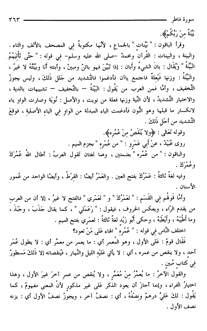 والقولُ الآخرُ: ما يُعمَّرُ مِنْ مُعَمَّرٍ، ولا يُنقص من عمرِ آخرَ غيرَ الأولِ، وهذا اختيارُ الفراء، وإنما أجازَ أن يعود الذكر عَلَى غير مذكورٍ لأنَّ المعنى مفهومٌ، كما يَقُولُ: لَكَ عَلَيَّ درهمٌ ونِصْفُهُ، أي: نصفُ آخر، ويجوزُ نصفُ الأولِ أي: يزنه نصف الأول.