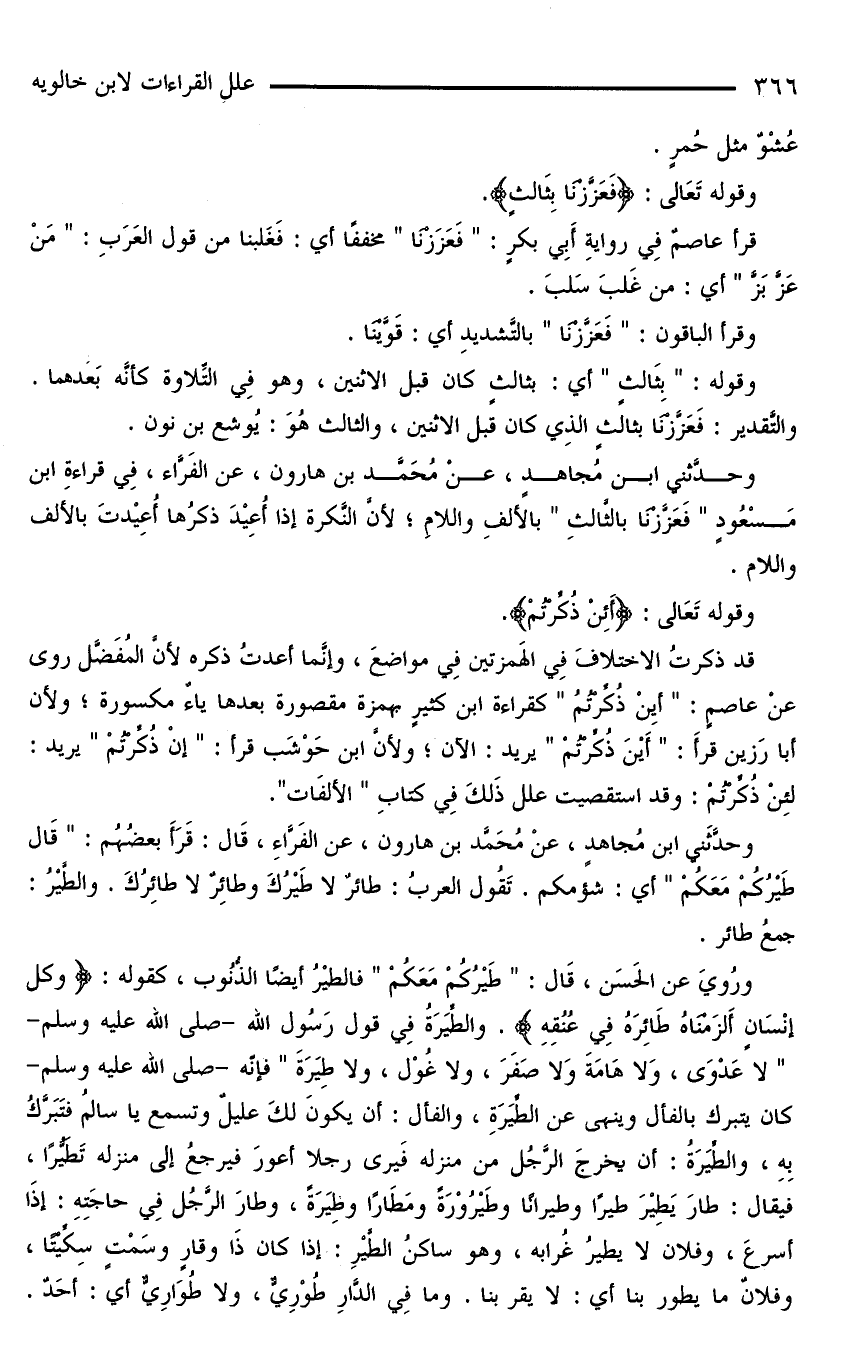 وحدَّثني ابنُ مُجاهدٍ، عنْ مُحَمَّد بْن هارون، عنْ الفَرَّاء، فِي قراءةِ ابنِ مَسْعُودٍ «فَعَزَّزْنَا بالثَّالثِ» بالألفِ واللَّامِ؛ لأنَّ النَّكرة إذا أعيد ذكرها أعيدت بالألف واللام.