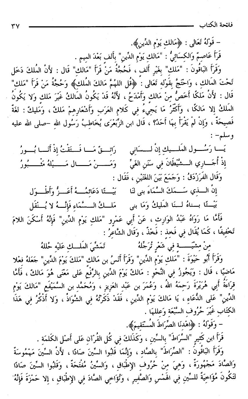 وَقَرَأَ الْبَاقُونَ: «مَلِكِ» بِغَيْرِ أَلِفٍ، فَحُجَّةُ مَنْ قَرَأَ «مَالِكِ» قَالَ: لِأَنَّ الْمُلْكَ دَخَلَ تَحْتَ الْمَالِكِ، وَاحْتَجَّ بِقَوْلِهِ تَعَالَى: {قُلِ اللَّهُمَّ مَالِكَ الْمُلْكِ} وَحُجَّةُ مَنْ قَرَأَ «مَلِكِ» قَالَ: لِأَنَّ مَلِكًا أَخَصُّ مِنْ مَالِكٍ وَأَمْدَحُ، لِأَنَّهُ قَدْ يَكُونُ الْمَالِكُ غَيْرَ مَلِكٍ وَلَا يَكُونُ الْمَلِكُ إِلَّا مَالِكًا، وَأَكْثَرُ مَا يَجِيءُ فِي كَلَامِ الْعَرَبِ وَأَشْعَارِهِمْ مَلِكٌ، وَمَلِيكٌ: لُغَةٌ فَصِيحَةٌ، وَإِنْ لَمْ يَقْرَأْ بِهَا أَحَدٌ؟ ، قَالَ ابْنُ الزِّبَعْرَى يُخَاطِبُ رَسُولَ اللَّهِ - صَلَّى اللَّهُ عَلَيْهِ وَسَلَّمَ -: