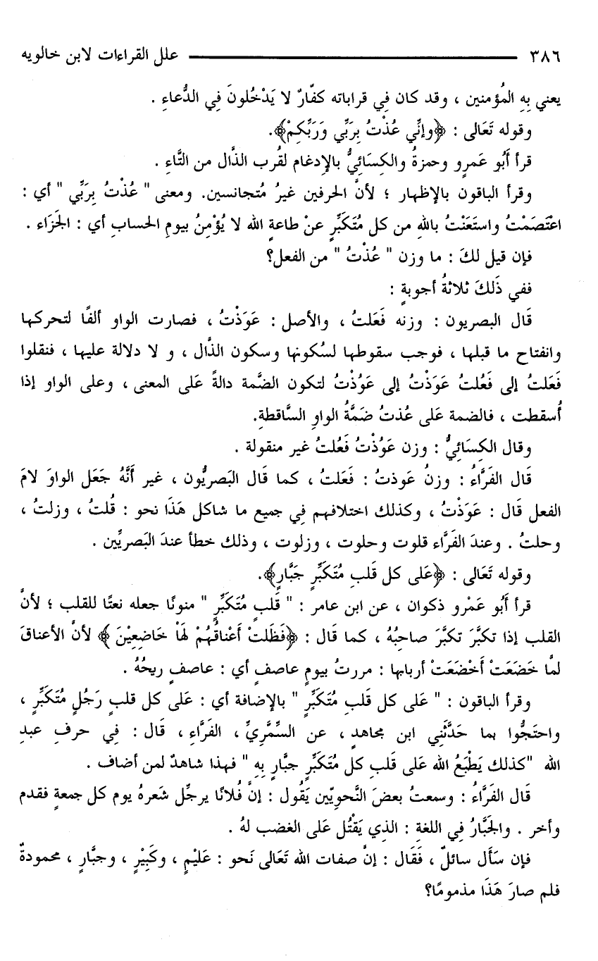 قرأ أبو عمرو ذكوان، عنْ ابْنُ عامر: «قَلْبٍ مُتَكَبِّرٍ» منونًا جعله نعتًا للقلب؛ لأنَّ القلب إذا تكبَّرَ تكبَّرَ صاحِبُهُ، كما قَالَ: {فَظَلَّتْ أَعْناقُهُمْ لَهَاْ خاضعين} لأن الأعناق لما خضعت أخضعت أربابها: مررت بيوم عاصف أي: عاصف ريحه.