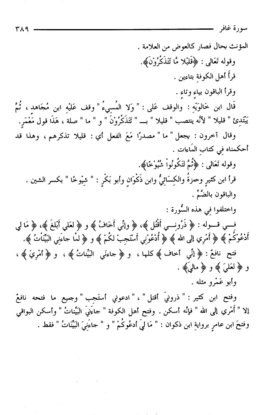 فِي قولُه: {ذَرُونِي أقتل}، {وإني أخاف} و {لعلي أبلغ}، {ما لي أَدْعُوْكُمْ} {أَمْرِي إلى اللَّه} {أُدْعُوْنِي أَسْتَجِبْ لَكُمْ} و {لَمَّا جاءَنِي البَيِّنَاْتُ}.