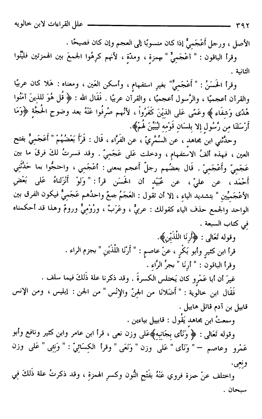وحدَّثني ابنُ مجاهدٍ، عنْ السِّمَّرِيّ، عنْ الفَرَّاء، قَالَ: قَرَأَ بَعْضُهُمْ «أَعَجَمِيُّ» بفتح العين، فهذه ألفُ الاستفهامِ، ودخلت عَلَى عَجَمِيّ. وقد فسرتُ لَكَ فرقَ ما بين عَجَمِيّ وأَعْجَمِيّ. قَالَ بعضُهم رجلٌ أَعجم بمعنى: أعْجَمِيِّ، واحتجُّوا بما حَدَّثَنِي أَحْمَد، عنْ عليّ، عنْ عُبَيْدٍ أن الْحَسَن قرآ: «وَلَوْ أنزلناه على بعض الأعجميين» بتشديد الياءِ، إلَّا أن تقولَ: العَجَمُ جمعٌ واحدُهم عَجَمِيٌّ فيكون الفرق بين الواحد والجمع حذف الياء كقولك: عربيٌّ، وعَرَبٌ، ورُوْمِيٌّ ورومٌ وهذا قد أحكمناه فِي كتاب السبعة.