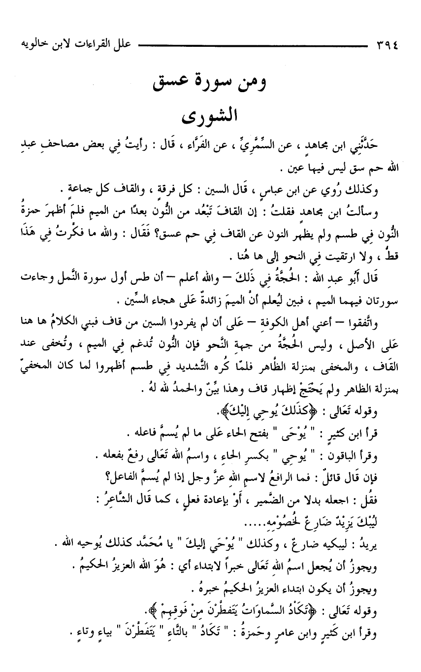 حَدَّثَنِي ابْنُ مجاهدٍ، عنْ السِّمَّرِيِّ، عنْ الفَرَّاء، قَالَ: رأيتُ فِي بعض مصاحفِ عبدِ اللَّه حم سق ليس فيها عين.