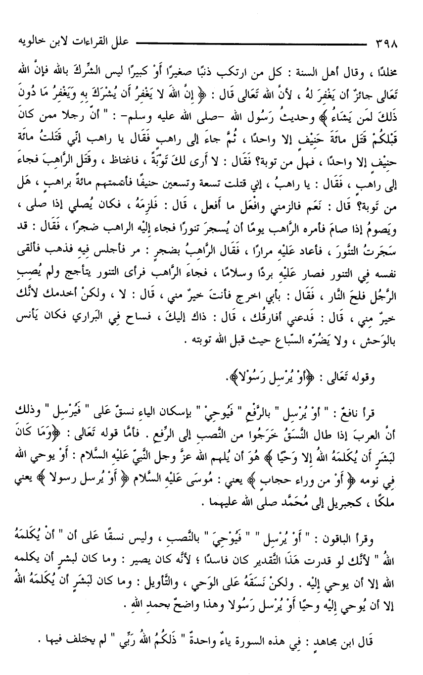 قرأ نافعٌ: «أوْ يُرْسِلُ» بالرَّفْعِ «فَيُوحِىْ» بإسكان الياءِ نسقٌ عَلَى «فَيُرْسِلَ» وذلك أنَّ العربَ إذا طال النَّسَقُ خَرَجُوا من النَّصبِ إلى الرِّفعِ. فأمَّا قولُه تَعَالى: {وما كان لبشر أن يكلمه الله إلا وَحْيًا} هُوَ أن يُلهم اللَّه عزَّ وجلَّ النَّبيّ عَلَيْهِ السَّلام: أَوْ يوحي اللَّه فِي نومه {أَوْ من وراء حجابٍ} يعني: مُوسَى عَلَيْهِ السَّلام {أَوْ يُرسلَ رسولًا} يعني ملكًا، كجبريل إلى مُحَمَّد صلّى اللَّه عليهما.