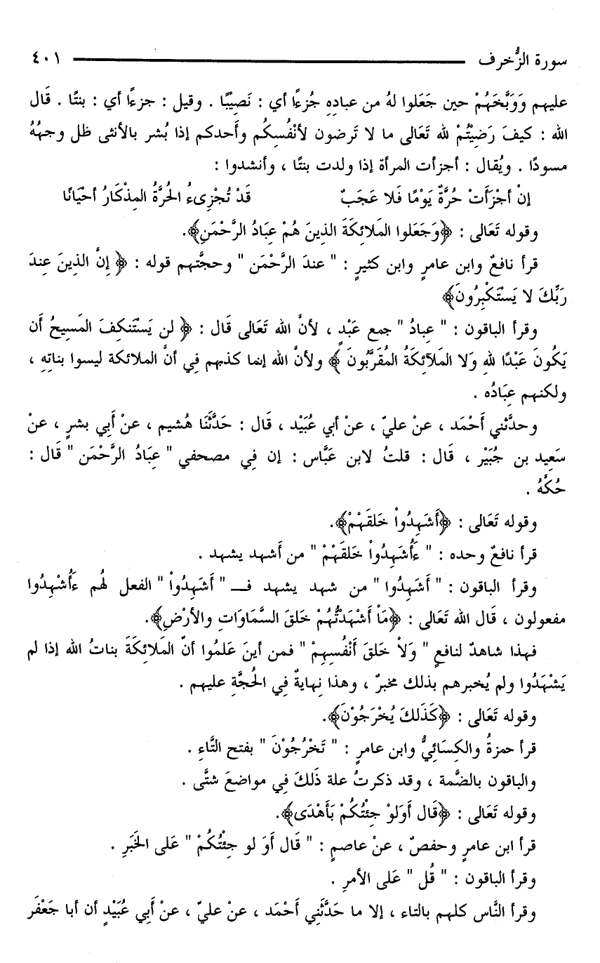 وقرأ الباقون: «عِبادُ» جمع عَبْدٍ، لأنَّ اللَّه تَعَالى قَالَ: {لَّن يَسْتَنكِفَ الْمَسِيحُ أَن يَكُونَ عَبْدًا لِّلّهِ وَلَا الْمَلآئِكَةُ الْمُقَرَّبُونَ} ولأنَّ اللَّه إنما كذبهم فِي أنَّ الملائكة ليسوا بناتِهِ، ولكنهم عِبَادُه.