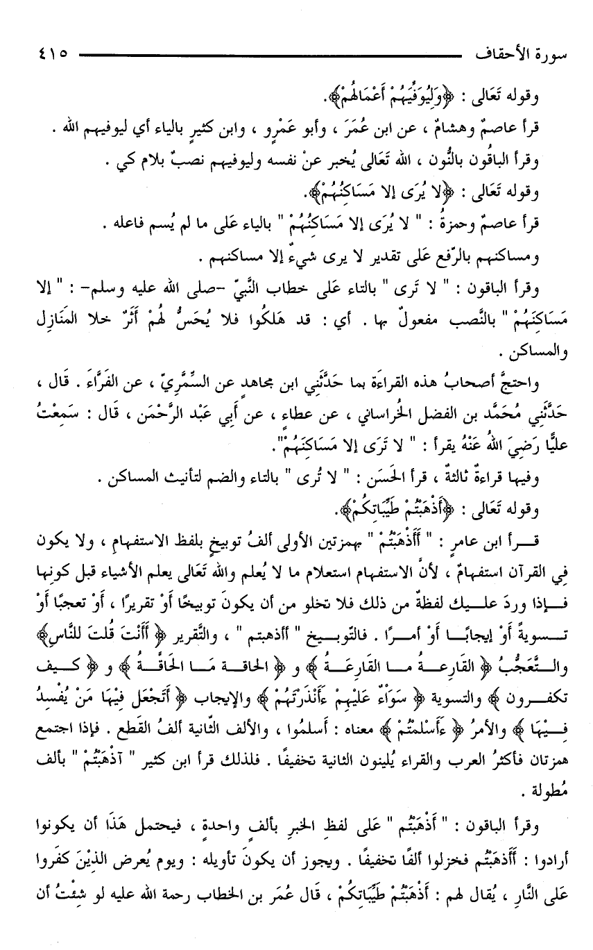 قرأ ابنُ عامرٍ: «أَأَذْهَبْتُمْ» بهمزتين الأولى ألفُ توبيخٍ بلفظ الاستفهامِ، ولا يكون فِي القرآن استفهامٌ، لأنَّ الاستفهام استعلام ما لا يُعلم والله تَعَالى يعلم الأشياء قبلَ كونِها فإذا وردَ عليك لفظةٌ من ذلك فلا تخلو من أن يكونَ توبيخًا أَوْ تقريرًا، أَوْ تعجبًا أَوْ تسويةً أَوْ إيجابًا أَوْ أمرًا. فالتّوبيخ «أأذهبتم»، والتَّقرير {أَأَنْتَ قُلْتَ لِلنَّاسِ} والتَّعَجُّبُ {القَارِعةُ ما القَارِعَةُ} و {الحاقة مَا الحَاقَّةُ} و {كيف تكفرون} والتسوية {سَوَاْءٌ عليهم أأنذرتهم} والإيجاب {أَتَجْعَلُ فِيْهَا مَنْ يُفْسِدُ فِيْهَا} والَأمرُ {أأسلمتم} معناه: أَسلِمُوا، والألف الثّانية ألفُ القَطع. فإذا اجتمع همزتان فأكثرُ العرب والقراء يُلينون الثانية تخفيفًا. فلذلك قرأ ابنُ كثير «آذْهَبْتُمْ» بألفِ مُطولة.