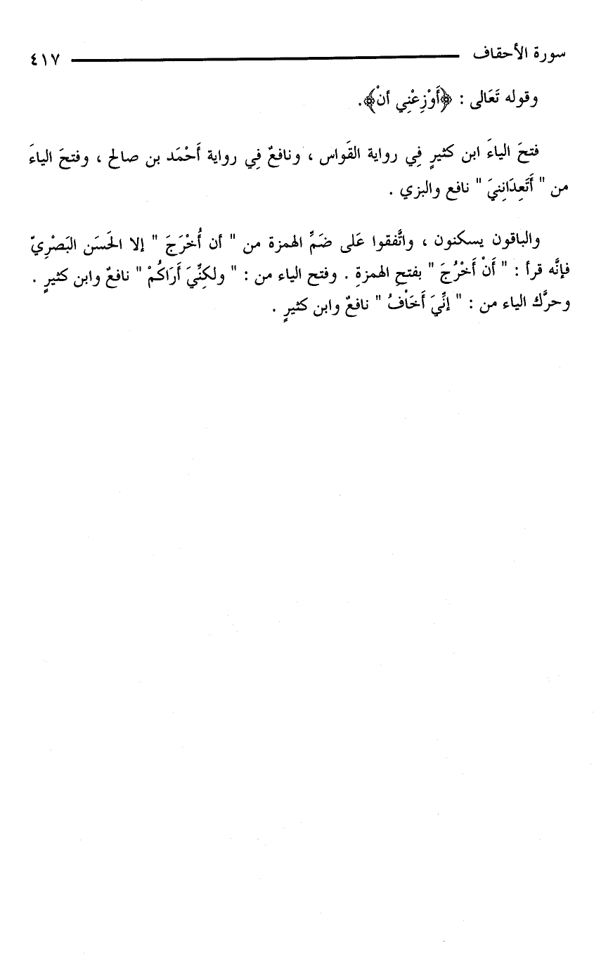 فتحَ الياءَ ابنُ كثيرٍ فِي رواية القَواس، ونافعُ فِي رواية أَحْمَد بْن صالح، وفتحَ الياءَ من «أَتَعِدَانِنيَ» نافع والبزي.