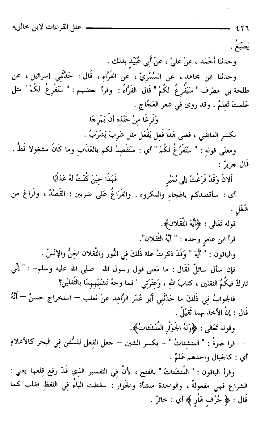 وحدثنا ابنُ مجاهدٍ، عنْ السِّمَّرِيّ، عنْ الفَرَّاءِ، قَالَ: حَدَّثَنِي إسرائيل، عنْ طلحة بْن مطرف «سَيَفْرِغُ لَكُمْ» قَالَ الفَرَّاءُ: وقرأ بعضهم: «سَنَفْرِغُ لَكْمْ» مثل عَلِمَتَ تَعِلمُ. وقد روى فِي شعر العَجَّاجِ.