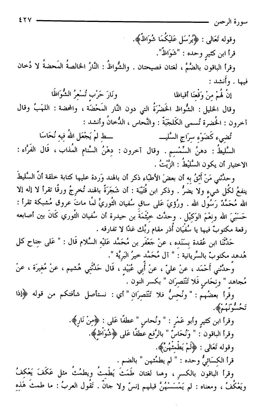 وقرأ الباقون بالضَمَّ، لغتان فصيحتان. والشُّواظُ: النَّارُ الخالصةُ المَحضةُ لا دُخان فيها. وأَنشد: