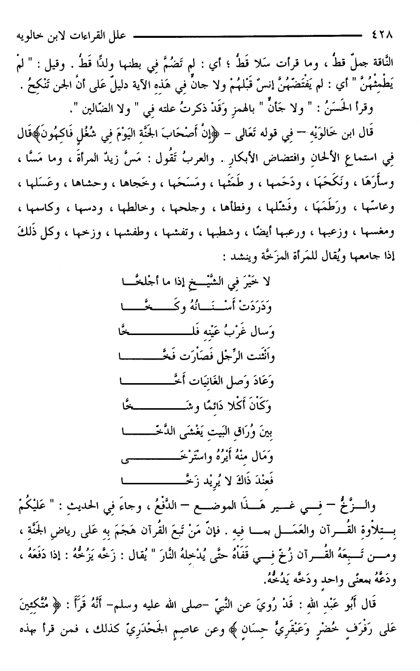 قَالَ أَبُو عَبْدِ اللَّهِ: قَدْ رُويَ عنْ النَّبيّ - صَلَّى اللَّهُ عَلَيْهِ وَسَلَّمَ - أَنَّهُ قَرََأَ: «مُتَّكِئِينَ عَلَى رَفْرَفٍ خُضْرٍ وَعَبْقَرِيٍّ حِسَانٍ» وعن عاصِمٍ الجَحْدَرِيّ كذلك، فمن قرأ بهذه