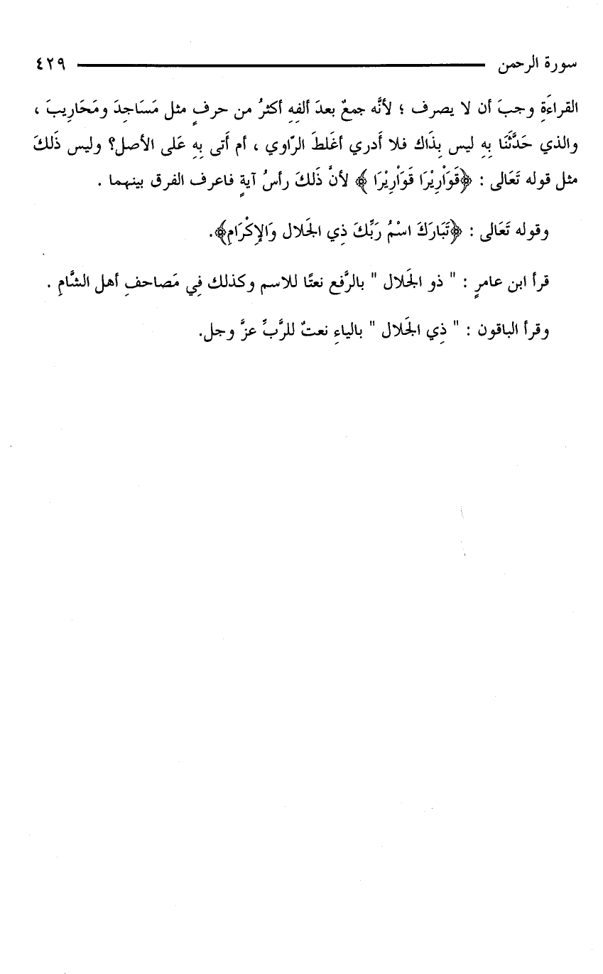 قرأ ابْنُ عامرٍ: «ذو الجَلالِ» بالرَّفع نعتًا للاسم وكذلك فِي مَصاحفِ أهلِ الشَّامِ.