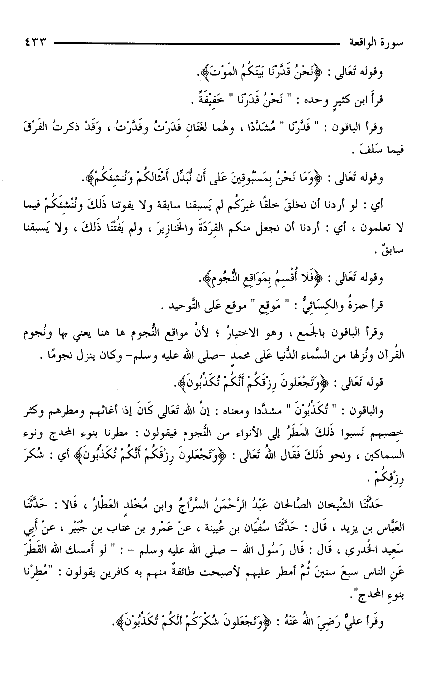 والباقون: «تُكَذِّبُوْنَ» مشدًّدا ومعناه: إنَّ اللَّه تَعَالى كَانَ إذا أغاثهم ومطرهم وكثر خِصبهم نَسبوا ذَلِكَ المَطَرُ إلى الأنواء من النُّجوم فيقولون: مطرنا بنوء المحدج ونوء السماكين، ونحو ذَلِكَ فَقَالَ اللَّهُ تَعَالى: {وَتَجْعَلُونَ رِزْقَكُمْ أَنَّكُمْ تُكَذِّبُونَ} أي: شُكرَ رِزْقِكُمْ.