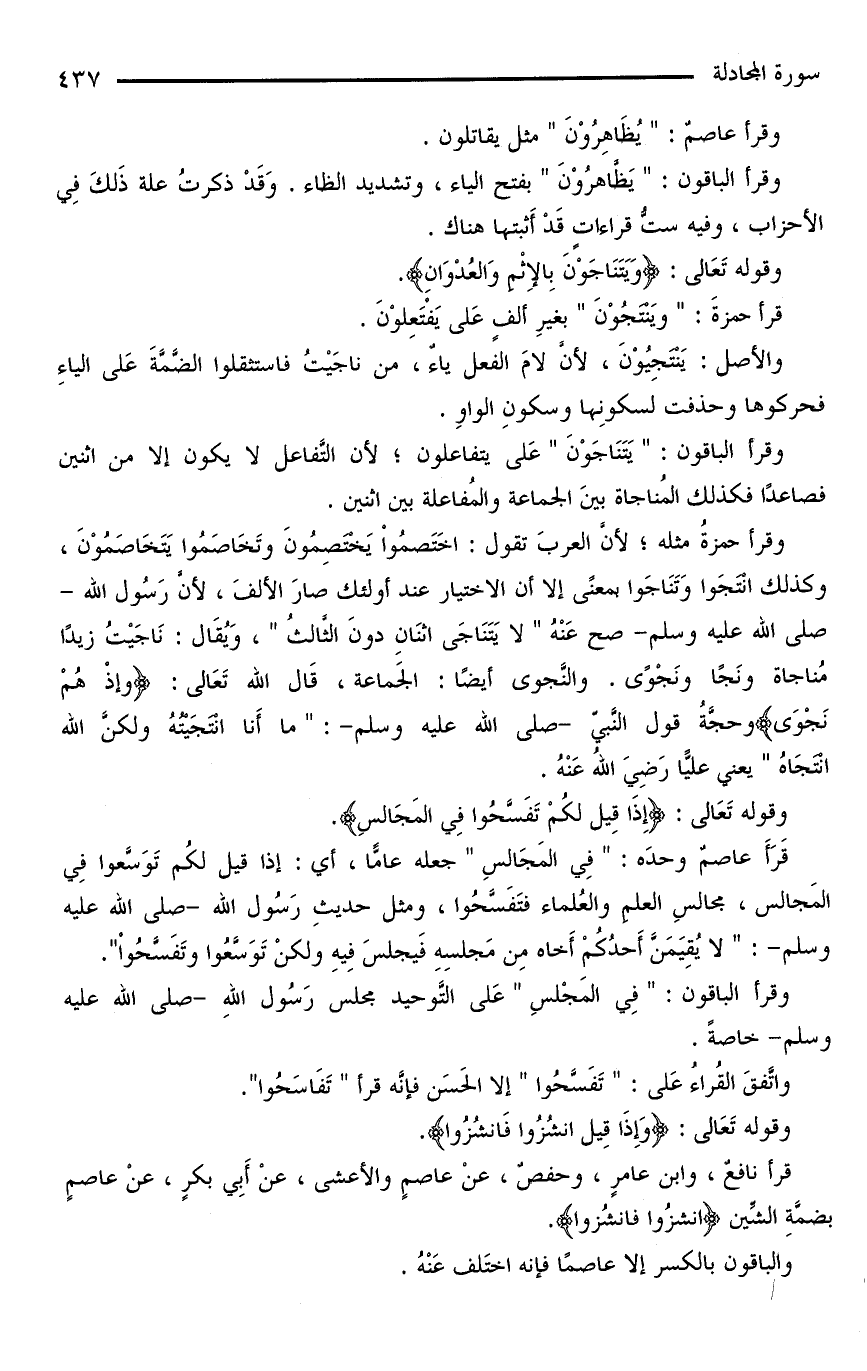 قَرَأَ عاصمٌ وحدَه: «فِي المَجَالِسِ» جعلَه عامًّا، أي: إذا قيلَ لَكُم تَوَسَّعواُ فِي المَجالس، مجالسِ العلمِ والعُلماء فتَفَسَّحُوا، ومثل حديث رسول الله - صلى الله عليه وسلم -: «لا يُقِيَمَنَّ أَحدُكُمْ أَخاه مِن مَجلِسِهِ فَيجلسَ فِيهِ ولكنْ تَوَسَّعُوا وتَفَسَّحُواْ».