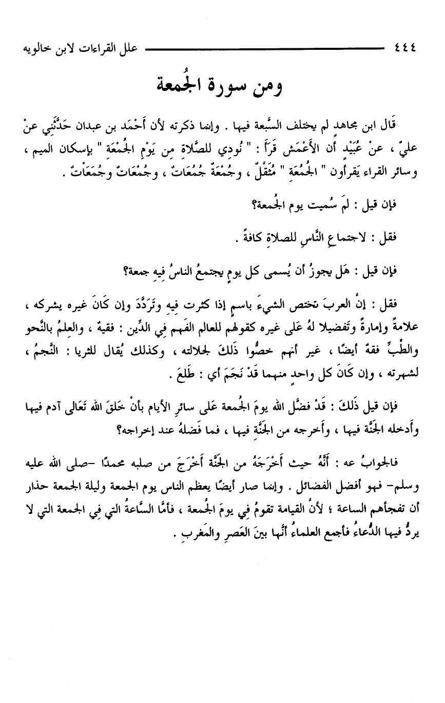 قَالَ ابنُ مجاهدٍ لم يختلف السَّبعة فيها. وإنما ذكرته لأن أَحْمَد بْن عبدان حَدَّثَنِي عنْ عليّ، عنْ عُبَيْدٍ أن الأعمش قرأ: «نودي للصلاة مِن يَوْمِ الْجُمُعَةِ» بإسكان الميم، وسائر القراء يقرءون «الجُمُعَةِ» مُثَقَّلٌ، وجَمْعُةٌ جُمُعَاتٌ، وجُمْعَاتٌ وجُمَعَاْتٌ.