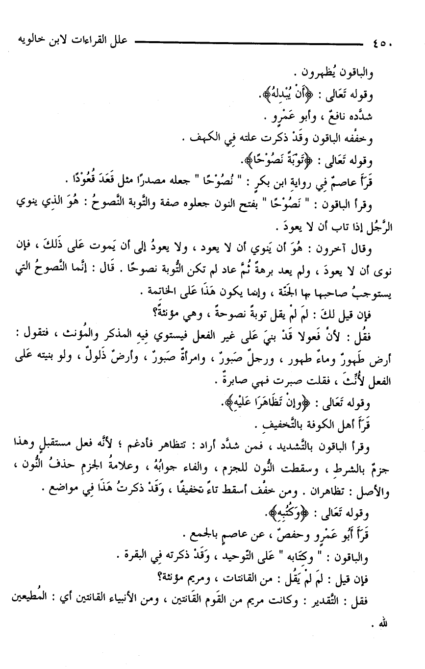 قَرَأَ عاصمٌ فِي روايةِ ابْنُ بكرٍ: «نُصُوْحًا» جعله مصدرًا مثل قَعَدَ قُعُوْدًا.