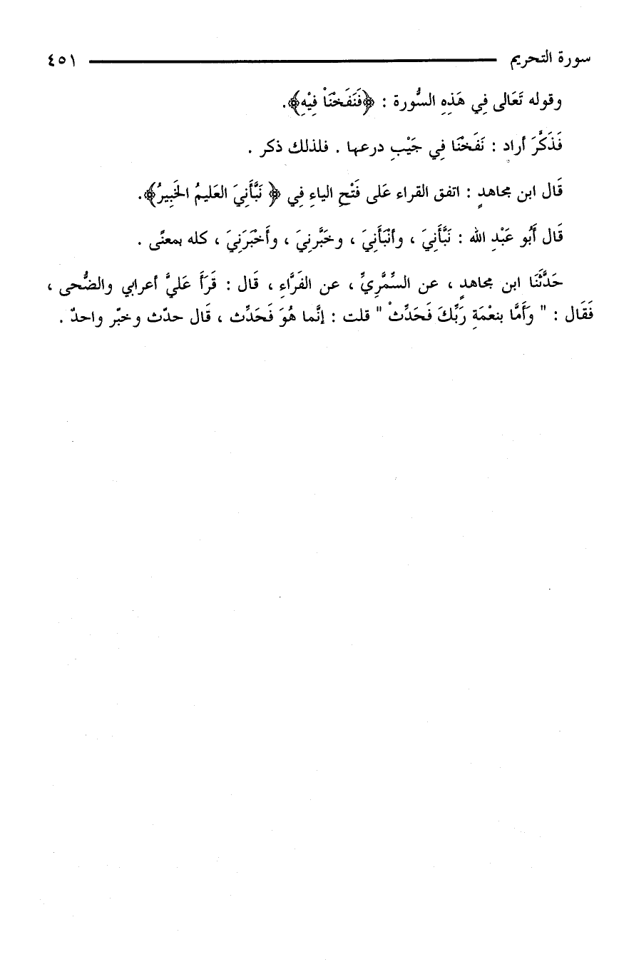 حَدَّثَنَا ابْنُ مجاهدٍ، عنْ السِّمَّرِيِّ، عنْ الفَرَّاءِ، قَالَ: قَرَأَ عَلَى أعرابي والضُّحى، فقال: «وأما بنعمة ربك فحدث» قلت: إنَّما هُوَ فَحَدِّث، قَالَ حدّث وخبّر واحد.