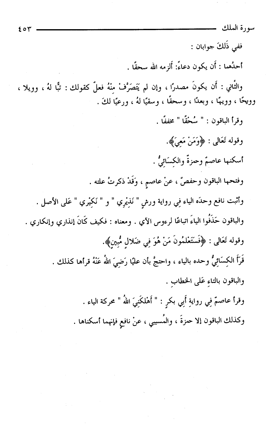 والباقون حَذَفُوا الياءَ اتباعًا لرءوس الآي. ومعناه: فكيف كَانَ إنذاري وإنكاري.