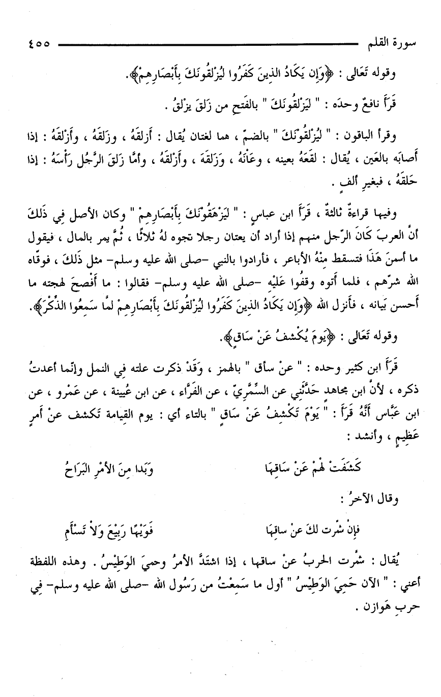وفيها قراءةٌ ثالثةٌ، قَرَأَ ابنُ عباسٍ: «لَيَزْهَقُوْنَكَ بِأَبْصَارِهِمْ» وكان الأصلُ فِي ذَلِكَ أنَّ العربَ كَانَ الرّجل منهم إذا أراد أن يعتان رجلًا تجوع لَهُ ثلاثًا، ثُمَّ يمر بالمال، فيقول ما أسمنَ هَذَا فتسقط مِنْهُ الَأباعر، فأرادوا بالنبي - صَلَّى اللَّهُ عَلَيْهِ وَسَلَّمَ - مثل ذَلِكَ، فوقّاه اللَّه شرّهم، فلما أَتوه وقفُوا عَلَيْهِ - صَلَّى اللَّهُ عَلَيْهِ وَسَلَّمَ - فقالوا: ما أَفْصحَ لهجته ما أَحسن بَيانه، فأَنزلَ اللَّه {وَإِن يَكَادُ الَّذِينَ كَفَرُوا لَيُزْلِقُونَكَ بِأَبْصَارِهِمْ لَمَّا سَمِعُوا الذِّكْرَ}.