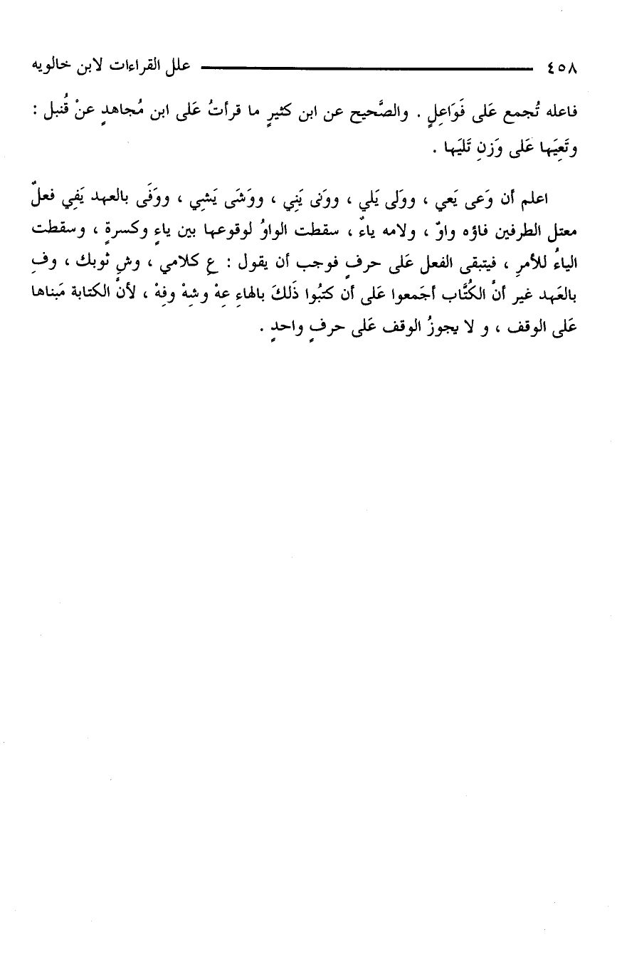 اعلم أن وَعى يَعى، ووَلى يَلِي، ووَني يَنِي، ووَشَى يشي، ووفى بالعهد يفي فعل معتل الطرفين فاؤه واوٌ، ولامه ياءٌ، سقطت الواوُ لوقوعها بين ياءٍ وكسرةٍ، وسقطت الياءُ للأمرِ، فيتبقى الفعلُ عَلَى حرفٍ فوجب أن يقولَ: عِ كلامي، وشِ ثوبك، وفِ بالعَهد غير أنَّ الكُتَّاب أجَمعوا عَلَى أن كتُبُوا ذَلِكَ بالهاءِ عِهْ وشِهْ وفِهْ، لأنَّ الكتابة مَبناها عَلَى الوقف، ولا يجوزُ الوقف عَلَى حرفٍ واحدٍ.
