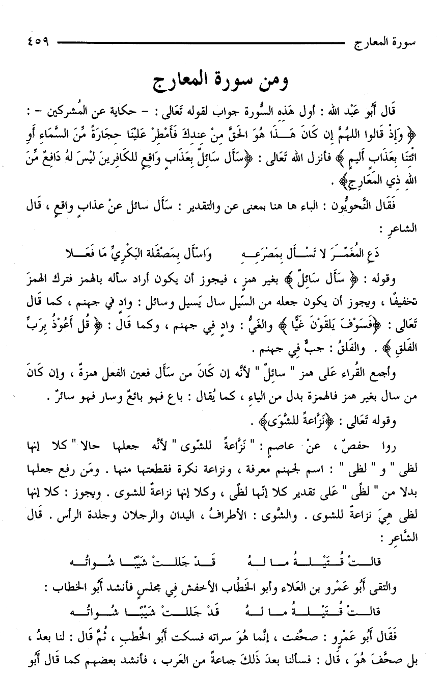 وقولُه: {سَأَلَ سَائِلٌ} بغير همزٍ، فيجوز أن يكون أراد سأله بالهمز فترك الهمزَ تخفيفًا، ويجوز أن يكون جعله من السّيل سال يَسيل وسائل: وادٍ في جهنم، كما قَالَ تَعَالى: {فَسَوْفَ يَلْقَوْنَ غَيًّا} والغَيُّ: وادٍ فِي جهنم، وكما قَالَ: {قُلْ أَعُوْذُ بِرَبِّ الفَلَقِ}. والفَلَقُ: جبٌّ فِي جهنم.