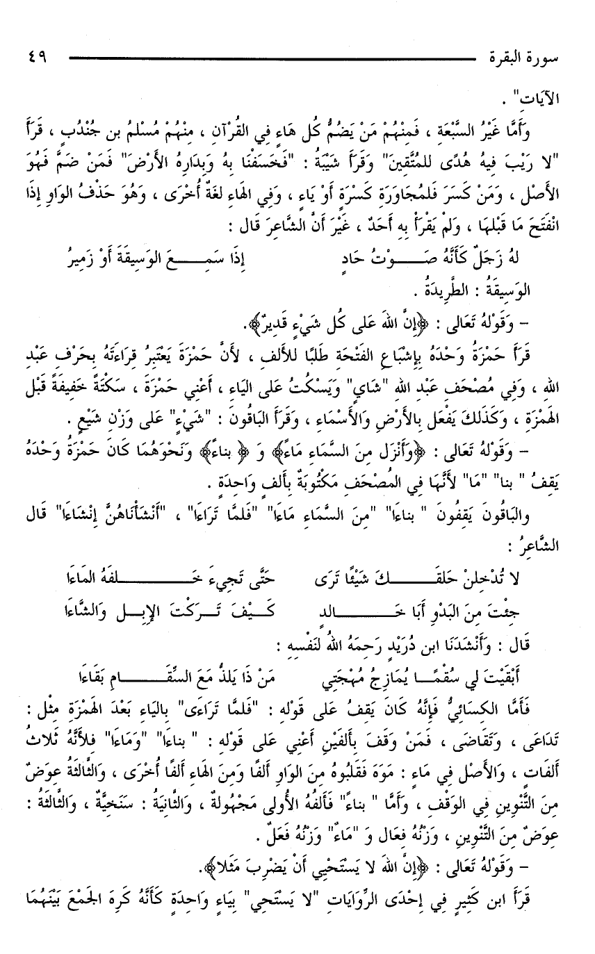 - وَقَوْلُهُ تَعَالَى: {وَأَنْزَلَ مِنَ السَّمَاءِ مَاءً} و {بِنَاءً} وَنَحْوَهُمَا كَانَ حَمْزَةُ وَحْدَهُ يَقِفُ «بِنَا» «مَا» لِأَنَّهَا فِي الْمُصْحَفِ مَكْتُوبَةٌ بألف واحدة.