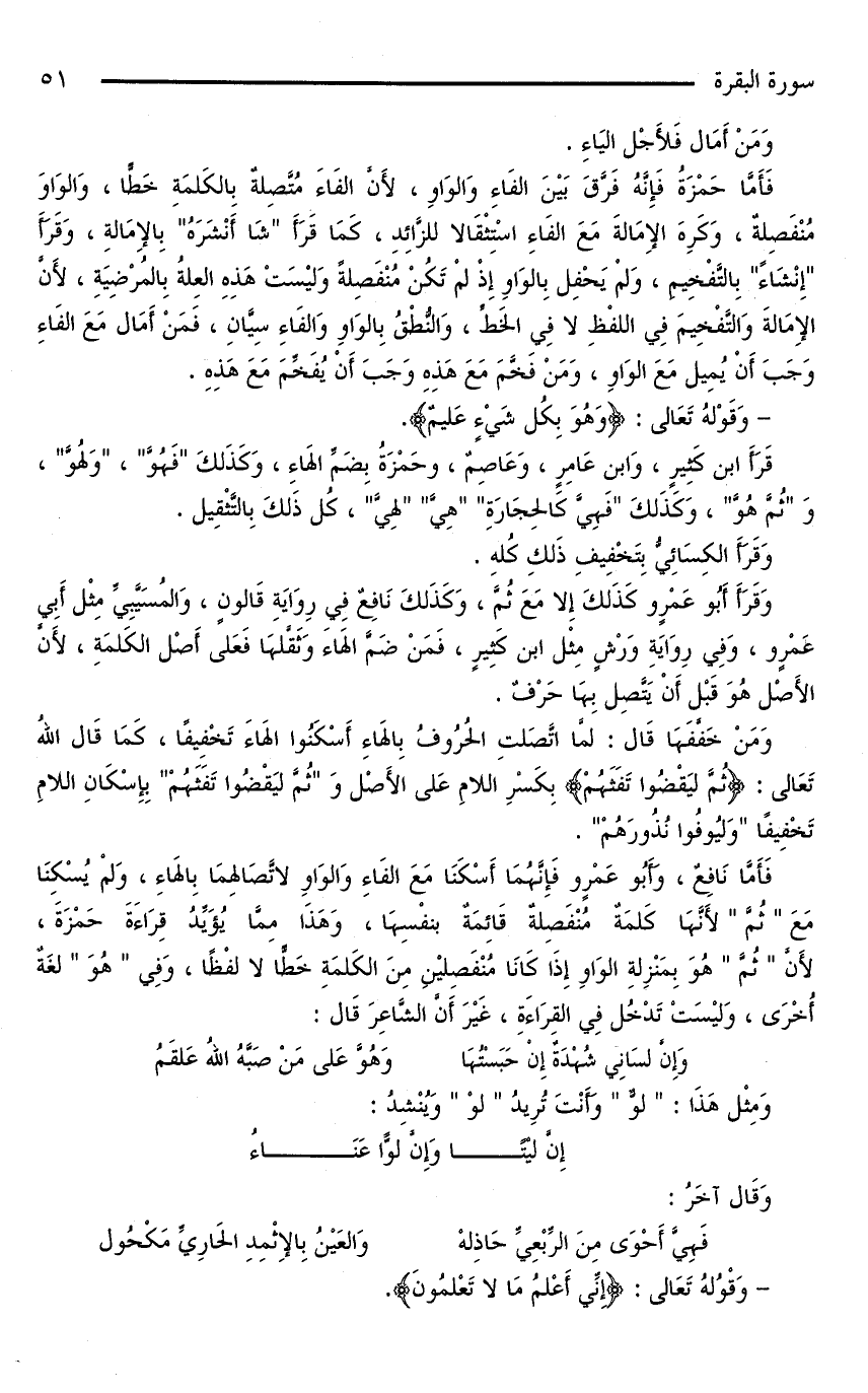 فَأَمَّا حَمْزَةُ فَإِنَّهُ فَرَّقَ بَيْنَ الْفَاءِ وَالْوَاوِ، لِأَنَّ الْفَاءَ مُتَّصِلَةٌ بِالْكَلِمَةِ خَطًّا، وَالْوَاوَ مُنْفَصِلَةٌ، وَكَرِهَ الْإِمَالَةَ مَعَ الْفَاءِ اسْتِثْقَالًا لِلزَّائِدِ، كَمَا قَرَأَ «شَا أَنْشَرَهُ» بِالْإِمَالَةِ، وَقَرَأَ «إِنْشَاءً» بِالتَّفْخِيمِ، وَلَمْ يَحْفِلْ بِالْوَاوِ إِذْ لَمْ تَكُنْ مُنْفَصِلَةً وَلَيْسَتْ هَذِهِ الْعِلَّةُ بِالْمُرْضِيَةِ، لِأَنَّ الْإِمَالَةَ وَالتَّفْخِيمَ فِي اللَّفْظِ لَا فِي الْخَطِّ، وَالنُّطْقُ بِالْوَاوِ وَالْفَاءِ سِيَّانِ، فَمَنْ أَمَالَ مَعَ الْفَاءِ وَجَبَ أَنْ يُمِيلَ مَعَ الْوَاوِ، وَمَنْ فَخَّمَ مَعَ هَذِهِ وَجَبَ أَنْ يُفَخِّمَ مَعَ هَذِهِ.