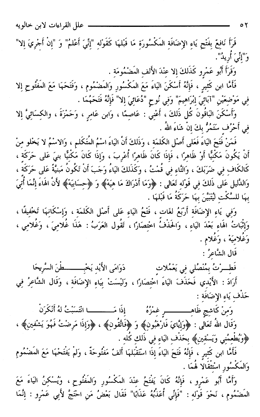قَرَأَ نَافِعٌ بِفَتْحِ يَاءِ الْإِضَافَةِ الْمَكْسُورَةِ مَا قَبْلَهَا كَقَوْلِهِ «إِنِّيَ أَعْلَمُ» وَ «إِنْ أَجْرِيَ إِلَّا» وَ «إِنِّيَ أُرِيدُ».